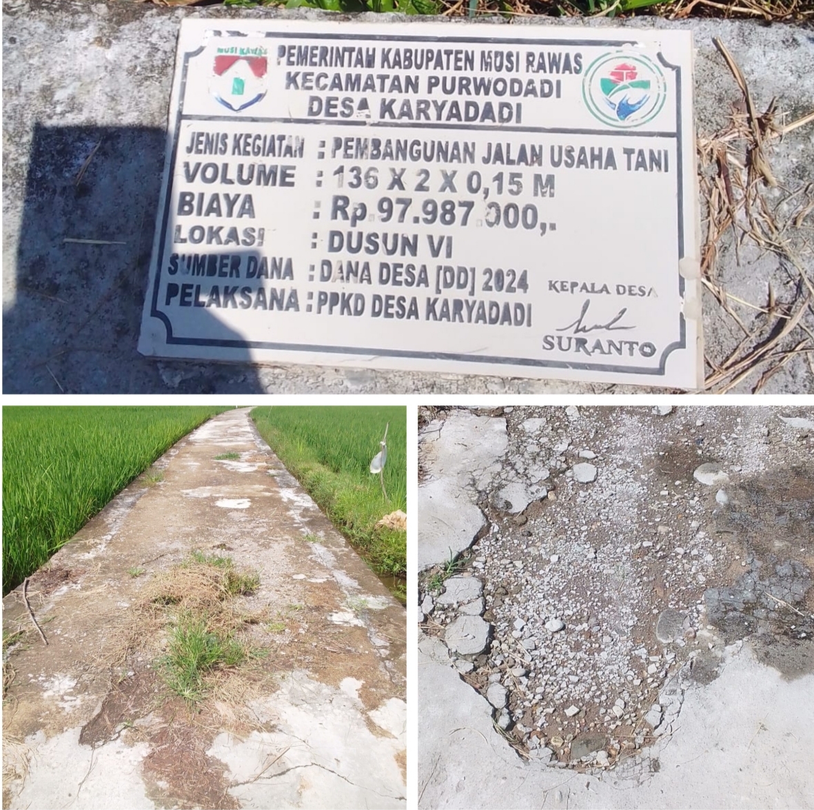 Berdasarkan hasil investigasi awak Media di lokasi di mana proyek jalan usaha tani (jut) tersebut, sudah mengalami, rusak parah, seperti retak, pecah pecah’ dan mengelupas, bahkan di tengah tengah sudah mulai di tumbuhi rumput. yang mana bangunan tersebut di bangun dari dana desa tahun 2024 dengan angaran sembilan puluh tujuh juta sembilan ratus delapan puluh tujuh ribu (97,987,000)dengan volume (136x2x0,15)Hal tersebut menimbulkan kecurigaan dalam pengerjaan di duga kuat ada pengurangan volume pisik maupun kualitas demi meraup keuntungan yang besar, sehingga dalam pengerjaan terlihat asal jadi.