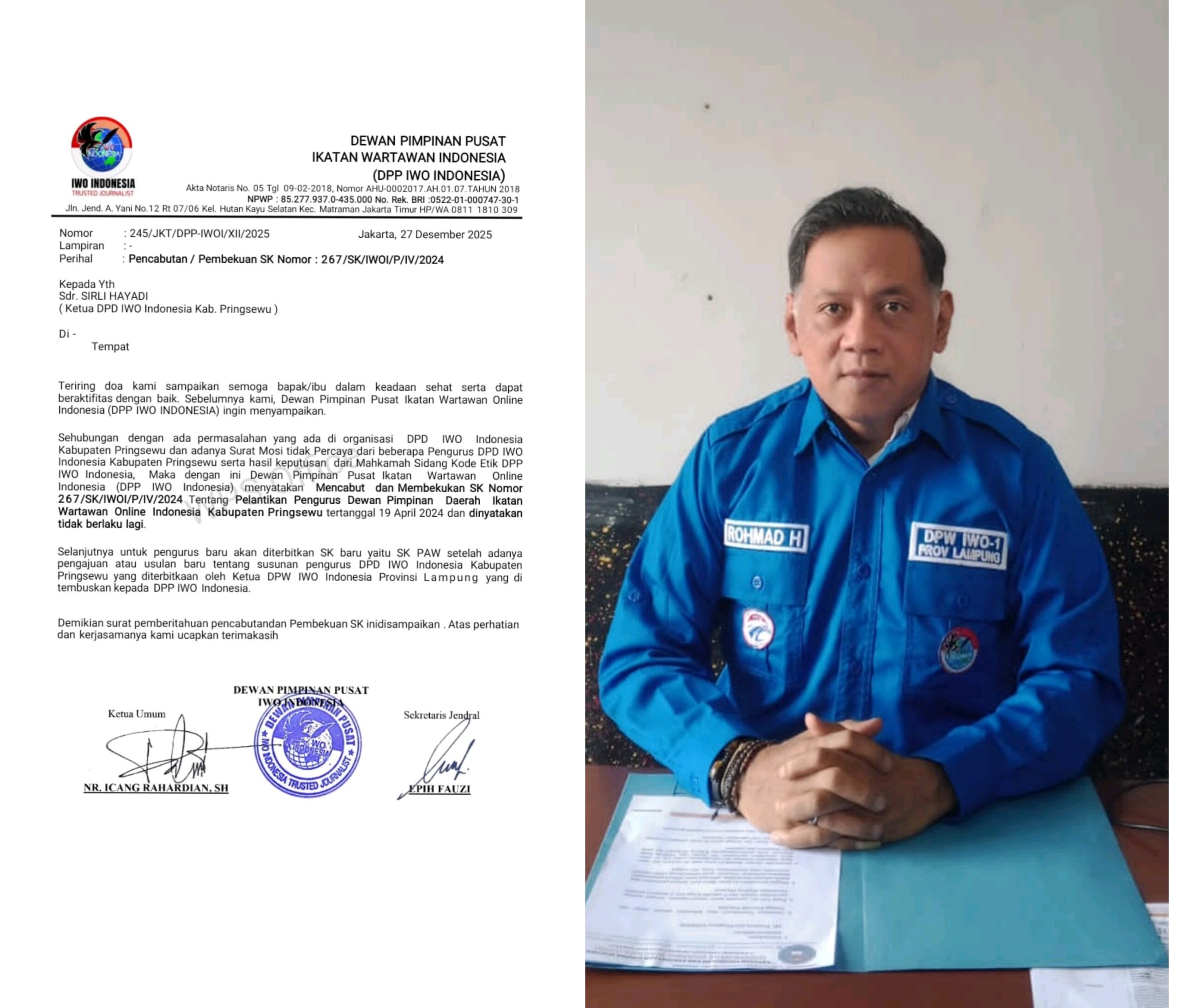 SaberPungli Com – Pringsewu, 04 Januari 2026 Indonesia Jurnalis -Dewan Pimpinan Pusat Ikatan Wartawan Online Indonesia (IWO-I) resmi mengeluarkan surat pembekuan dan pencabutan Surat